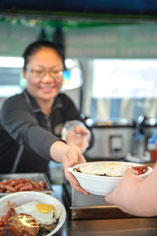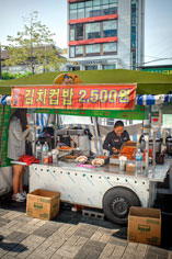 鷺梁津コッパプ(カップごはん)横丁 地下鉄1号線、鷺梁津(ノリャンジン)駅の向かいには数多くの露店が並んでいます。ここで売られているのは、プラスチックの容器にご飯を入れ、その上におかずを乗せどんぶりのように販売するカップごはん(コッパプ)。近くには公務員試験などのための学校や塾が集まっており、食事を安く済ませたい学生たちに人気があります。 |
