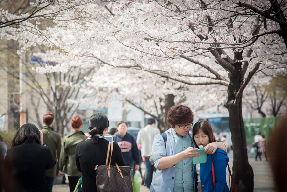 日本のお花見といえば、お弁当やお酒を携えて、桜を愛でながら宴会を催し楽しむというスタイルが一般的ですが、韓国では公園などを散策しながら、桜を愛でるスタイルが一般的となります。桜でピンクに染まった光景の中を、散策する人たちで賑わいます。日本と同様に、夜には桜がライトアップされて、昼間とはまた違った幻想的な世界を楽しむことができます。