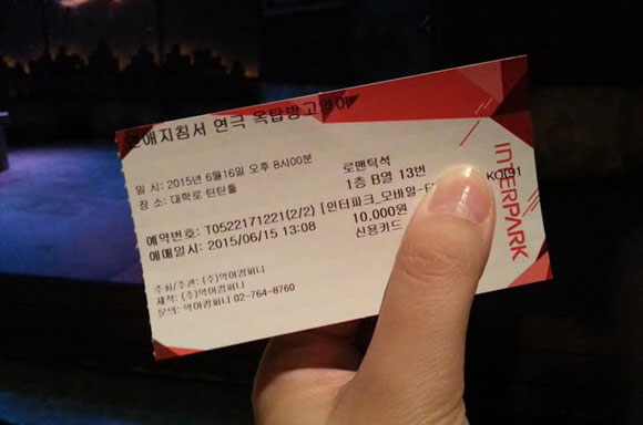 中東呼吸器症候群(MERS)の影響で、すっかり元気をなくしてしまったソウル・大学路(テハンノ)。やはり、狭い空間に長時間人が集まっている劇場などには大打撃だと聞いていましたが、入場の際には、しっかり消毒ができるブースも用意されていて、とりあえずは安心。MERSよりも、作品の人気のほうが強かった!と感じる、満員御礼の客席。幸い、前から2列目で観劇することができました。