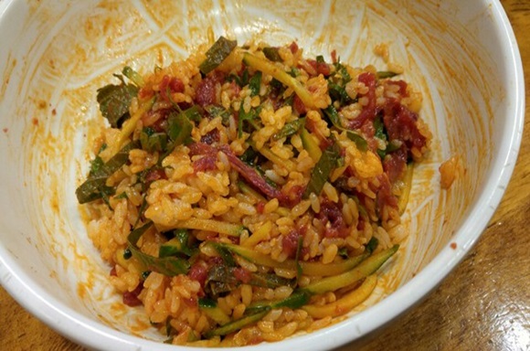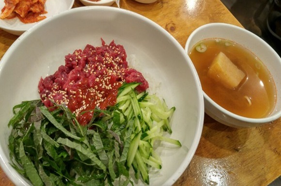 たったの6,000ウォンで、下のご飯が見えないぐらいのユッケが乗せられて登場します!エゴマの葉、キュウリといったシンプルな具材と混ぜ混ぜしていただくだけの簡単な食事です♪