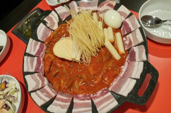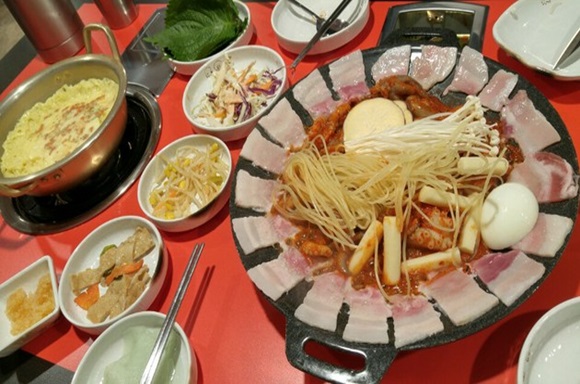 そんなチュックミと抜群の相性なのが「サムギョプサル」です。チュックミと豚肉がひとつの鉄板に乗っているものが「チュックミ」+「サムギョプサル」で「チュサム」というものです。