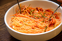 食べれば食べるほど辛さが増す「豊南コルベンイ」。これは唐辛子粉をヤンニョムに使っている証拠!辛いものが苦手な方は注文のときに、「メプチアンケ へジュセヨ(맵지않게 해주세요/辛くしないでください)」と伝えましょう。そしてテーブルごとに酢が置かれています。少し酸味を加えてみたいとき、お好みに合わせて適度な量を入れてみましょう。 |