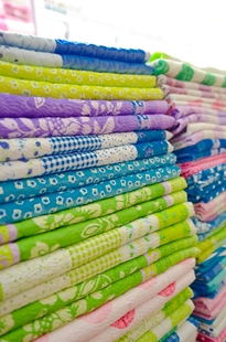 3階~4階 生地 3階と4階には生地が販売されています。この階では服飾関係のお仕事に携わっているような人が大きな袋をもって、生地を見ている姿が目につきます。各店舗にはカタログが準備されていることが多く、気に入ったものがあれば店頭に出ていない布でも倉庫から持ってきてくれます。なお、市場ではメートルではなく「マ」(=ヤード、約91㎝)という単位が使われています。「1マ(ハンマ)当り、~ウォン」という方法で計算します。