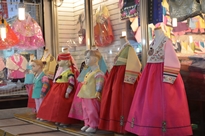 お土産探し ■韓服卸値価格で買える韓服店がたくさん軒を連ねており、オーダーメイドも可能です。シルクのオーダーメイドで40万ウォンくらいが目安だそうです。「ノリゲ」などの装飾品も充実しており、インナー、靴、足袋まで一式そろっています。各店舗には仕上がった韓服はもちろん、オーダー注文に必要なジュダン(絹織物)、ポモク(麻布と木綿)といった布地類もしっかり用意されています。 |